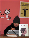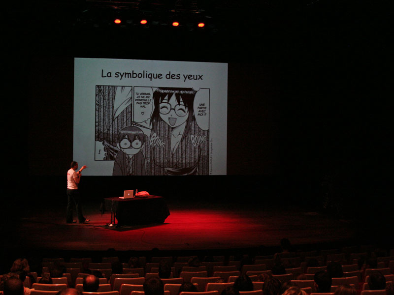 Angoulême 2009, c'était aussi la possibilité de voir le directeur de collection de Kurokawa, Grégoire Hellot, se donner en spectacle. Cette année, il avait droit à la salle Buñuel pour initier le jeune public et les parents aux spécificités du manga. Une fois de plus, il a été irréprochable malgré un économiseur d'écran qui avait une fâcheuse tendance à se déclencher un peu trop rapidement. |