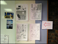 La troisième exposition, encore plus modeste mais non dénuée d'intérêt, permettait de voir quelques travaux de Junko Kawakami, l'auteure de It's Your World. On pouvait même voir la mangaka travailler sur les planches d'une de ses séries actuellement en cours au Japon et qui devaient être terminées, festival d'Angoulême ou pas. On ne rigole pas avec les délais au Japon.