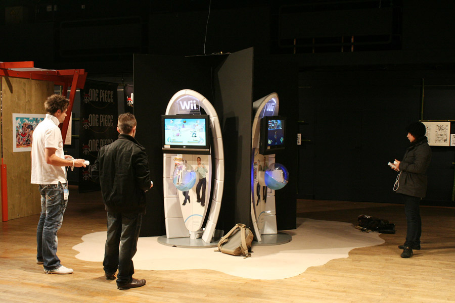 Une nouvelle fois, on pouvait remarquer une organisation en quatre zones de la salle Iribe. Une première partie était consacrée au monde des pirates en général afin de présenter son traitement dans la culture populaire occidentale par le biais du cinéma et de la bande dessinée. Dommage qu'il n'ait pas été possible d'y exposer le canon que se proposait de prêter le Musée de la marine. Malheureusement, le parallèle qu'il fallait faire ensuite avec l'univers déjanté de One Piece ne s'imposait pas de lui-même, d'autant plus qu'il n'était absolument pas nécessaire de commencer par là. Les trois autres murs de la salle présentaient des fac-similés de planches réalisées par Eiichiro Oda. Ces reproductions étaient tellement bien réalisées qu'on pouvait les prendre pour des originaux (ce qui a été mon cas) si on n'était pas suffisamment attentif. Impressionnant ! Deux couloirs proposaient des illustrations en couleur et des décors issus de la série télé. Enfin, le centre de la salle faisait dans le produit dérivé, rappelant que l'heure est au media mix : outre l'énorme Chopper gonflable que les visiteurs de Japan Expo connaissent bien grâce au stand Kana Vidéo, il était possible de jouer sur plusieurs consoles Wii. De plus, les plus jeunes étaient invités à dessiner autour d'une table basse leur vision de l'univers de One Piece.